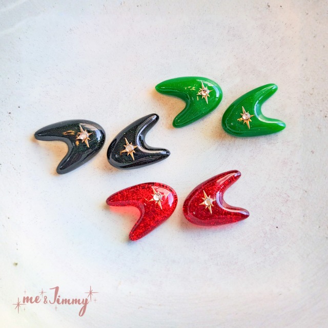 スターバーストがきらりと輝く50'sモチーフのブーメラン型ミニピアス・イヤリング。 コンパクトながら存在感のあるレトロなフォルムは、重ね付けや普段使いにもぴったり。 クリスマスやホリデーシーズンはもちろん、春夏秋冬活躍するアクセサリーです。 【選べる3色】クリスマス・ホリデー気分にぴったりなカラー展開 ◆Candy Red(キャンディレッド) ピュアで深みのあるクリアレッドの奥に、細かなグリッターの魅惑的なきらめきが透けるレッド。 ◆Twinkle Green(トゥインクルグリーン) 手に取ったあなたにだけわかる、とっても儚いゴールドパールがほのかに煌めくビビッドグリーン。 ◆Magical Black(マジカルブラック) グリーンの小さなラメが品よく透けるレディなブラック。 【こんな方におすすめ】 ・ロカビリー・50'sヴィンテージスタイルがお好きな方 ・レトロなミニピアスをお探しの方 ・重ね付け用のアクセサリーをお探しの方 ・色違いでコレクションしたい方 ・クリスマスプレゼント、プチギフトとして 【使い方のご提案】 ✓コーディネートやヘアメイクに合わせて色違いで ✓コンパクトサイズなので重ね付けアレンジも◎ ✓お友達やご家族とのお揃いにも --------------------------------- 【金具の選択】 ご注文時に以下からお選びください ◆ピアス ・純チタンポスト ・樹脂ポスト ◆イヤリング(金属アレルギー対応) ・サージカルステンレス316L(+220円) ・ノンホールピアス(+165円) ※形状は画像をご参照ください --------------------------------- 【ラッピング】 ・一点一点オリジナル台紙にセットしてオーガンジー巾着袋でお届け ・贈り物の場合は大きめの台紙に変更可能(ご注文時の【無料ラッピング】で承ります) ・ロゴステッカー付き手提げ袋は1枚¥275で承ります ※商品や時期により素材・カラー・デザインが変更になる場合があります --------------------------------- 【素材その他】 レジン・プレシオサ社製クリスタルラインストーン他 サイズ:約10mm×15mm ★ご不明点など些細なことでもお気軽にお問合せください(^-^) ---------------ご購入の際の注意点---------------------- 1. 発送・返品・交換について ・発送後の破損や紛失については、原則責任を負いかねます。 ・万が一の不具合、不着等には誠実に対応させていただきますのでお気づきの点はご連絡をお願い致します。 ・また、プラス料金になりますが補償のある発送方法(例:宅配便)にも対応可能ですので、ご希望の際には事前にご相談ください。 ・お客様都合による返品・交換はお受けできませんのであらかじめご了承ください。 2. 再発送について ・お届け先情報の不備、不在票の保管期限切れによる再発送の場合は、着払いまたは送料・手数料のご負担をお願いしております。 3. アレルギーについて ・金属アレルギーやレジンアレルギーの方は、十分ご注意ください。 ・アレルギー対応の金具等を使用している場合でも、体質によりアレルギー反応が出る場合がございますので、完全な保証はできかねます。 4. 商品の特性について ・ハンドメイド品のため、同デザインにも個体差があります。 色味やサイズ、形のわずかな違いや、気泡、色ムラなどが含まれる場合がありますので予めご了承ください。 ・ご覧になる環境(モニター設定、照明など)により、実物と色が異なって見える場合がございます。 ・ご使用後は柔らかい布で皮脂・メイク・汗などの汚れはしっかり拭きとっていただき、日に当たらず風通しの良い涼しい場所での保管をお願い致します。 ・香水やヘアスプレー等との接触は、変色や劣化の原因となる場合がありますのでご注意ください。 5. キャンセルについて ・発送後のお客様都合によるキャンセルはお受けできませんので、予めご了承ください