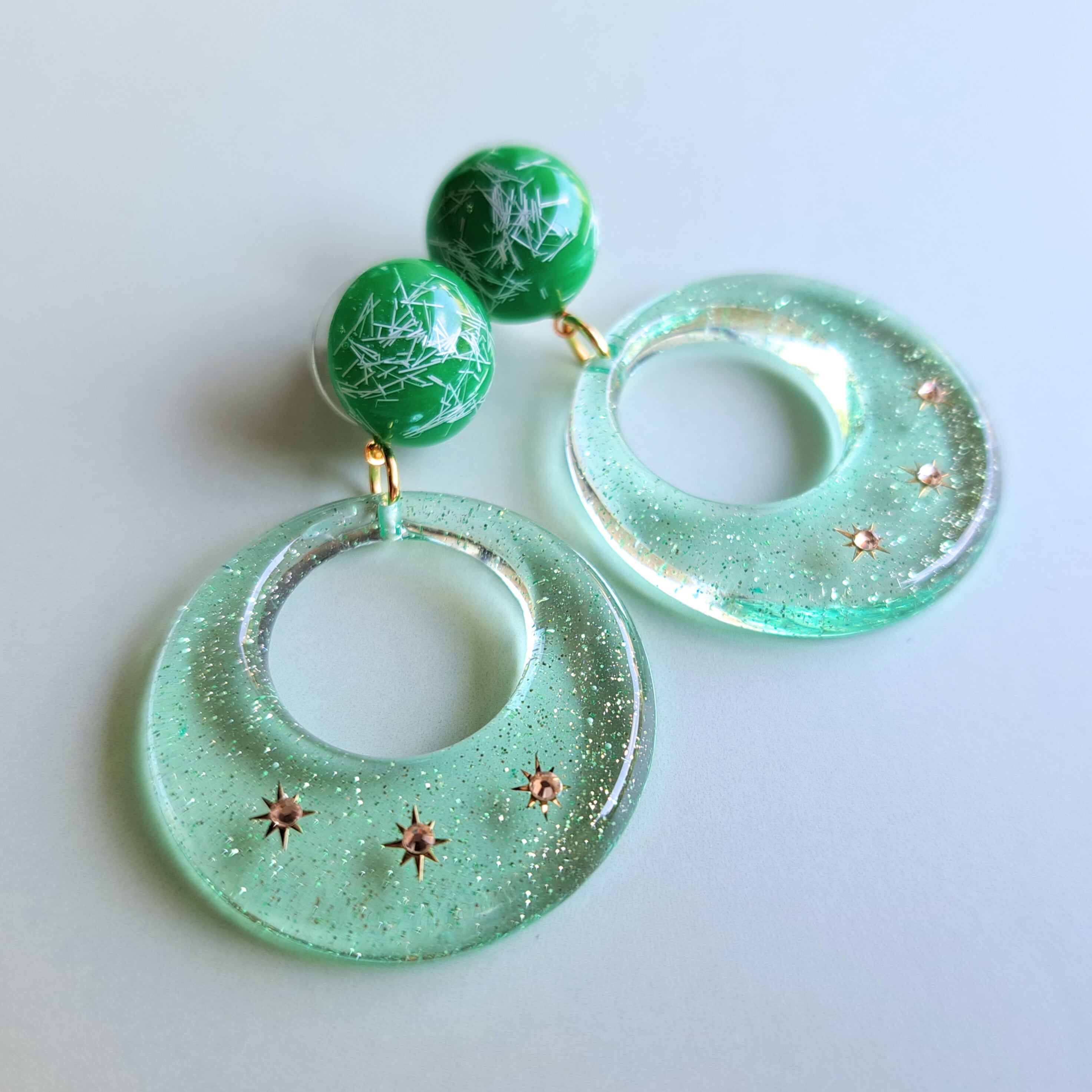 50'sグリッタークリア サークルピアス・イヤリング【サマーグリーン】 Retro 50's Glittering Clear Green Hoop Earrings/Rockabilly ロカビリー ロックンロール 50's 50s 1950s 1950's 50年代 ミッドセンチュリー スターバースト 1950年代 フィフティーズ | me & Jimmy