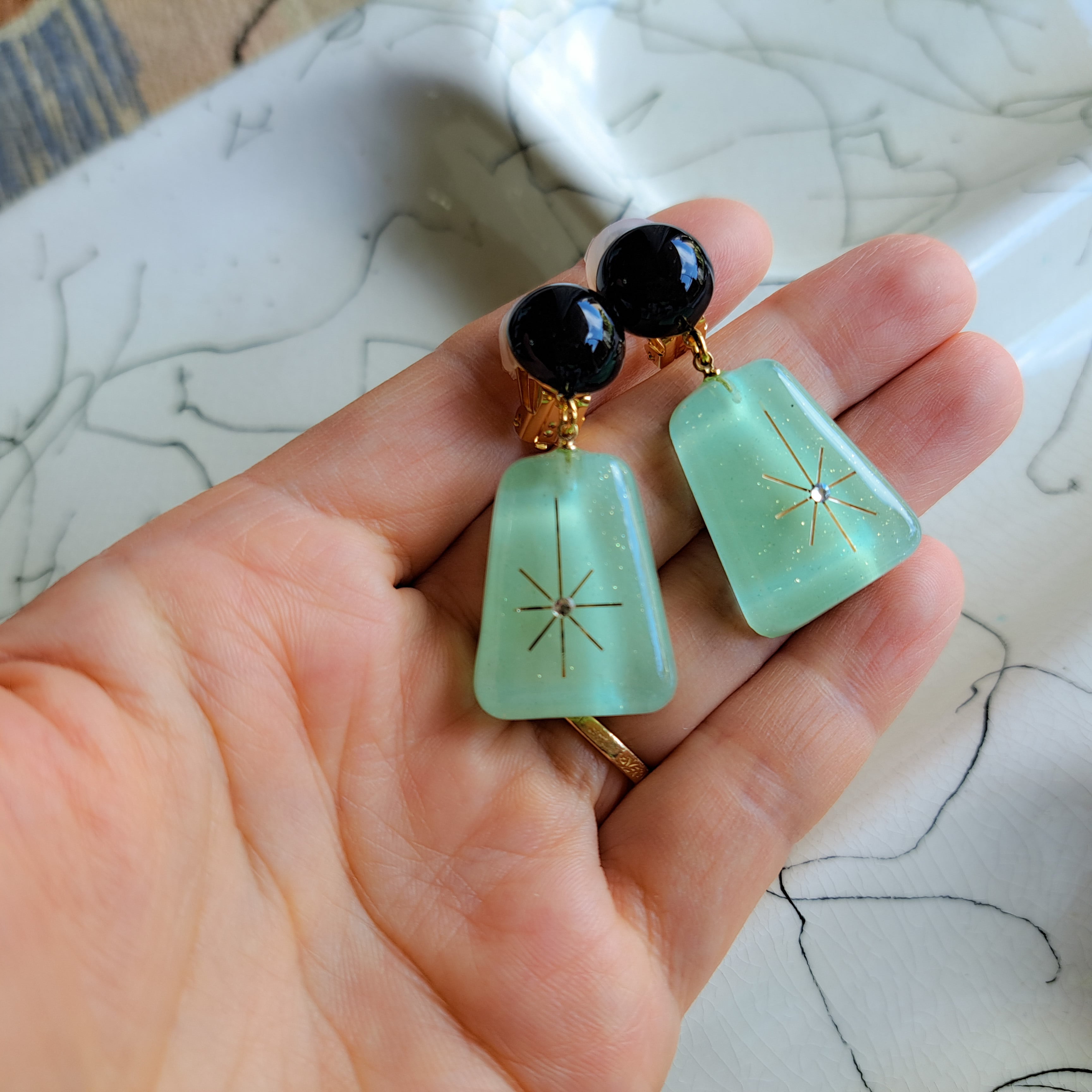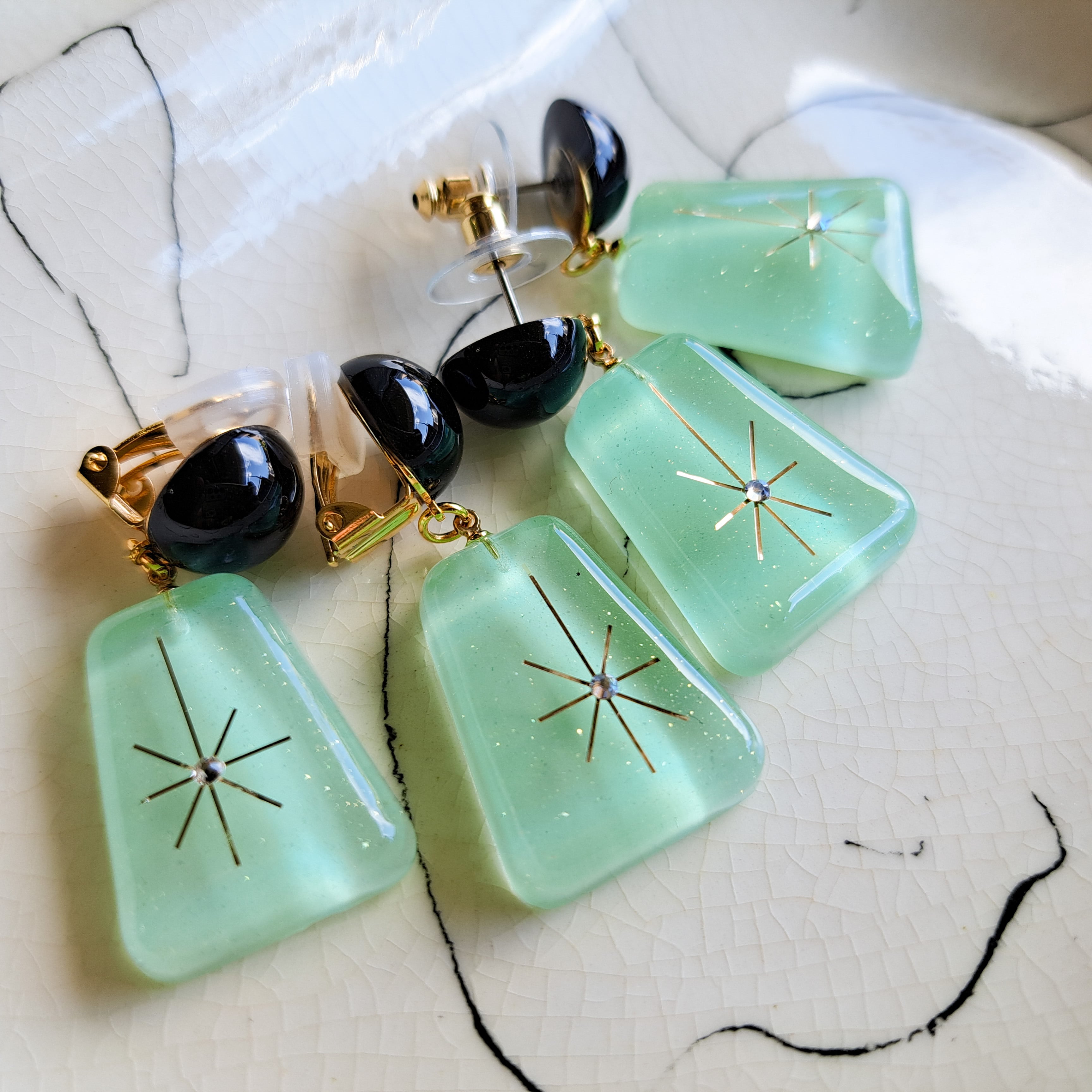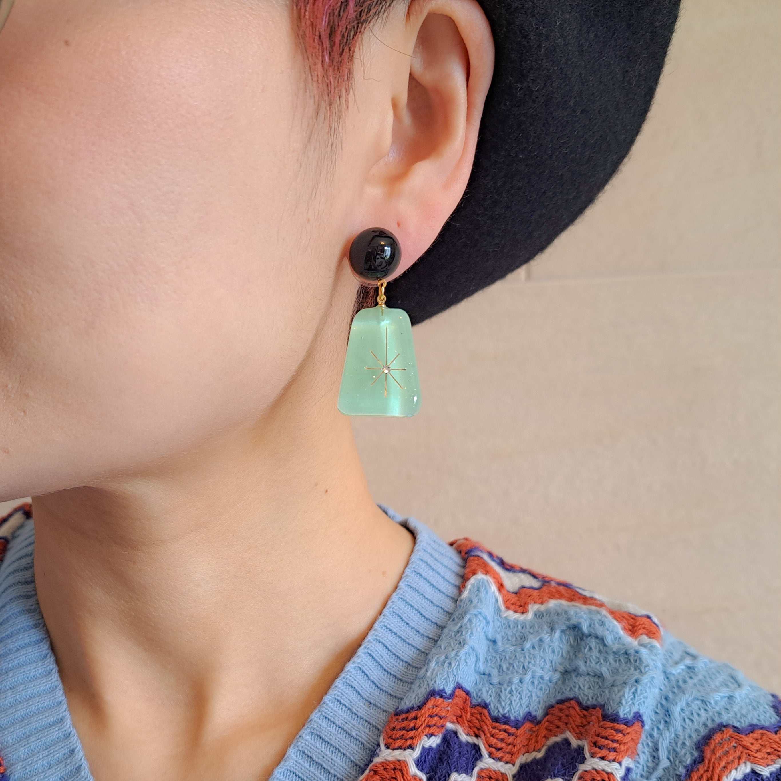 コロンとした香水瓶のフォルムと、メタルラインのスターバーストがキラリと目を引く、レトロエレガントなドロップピアス。