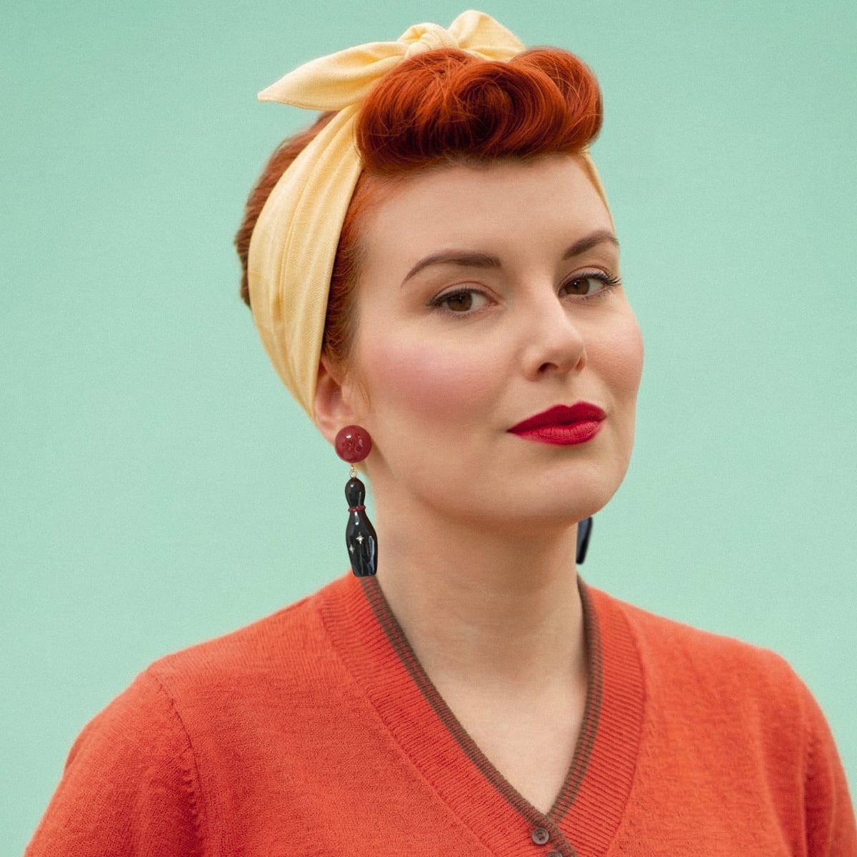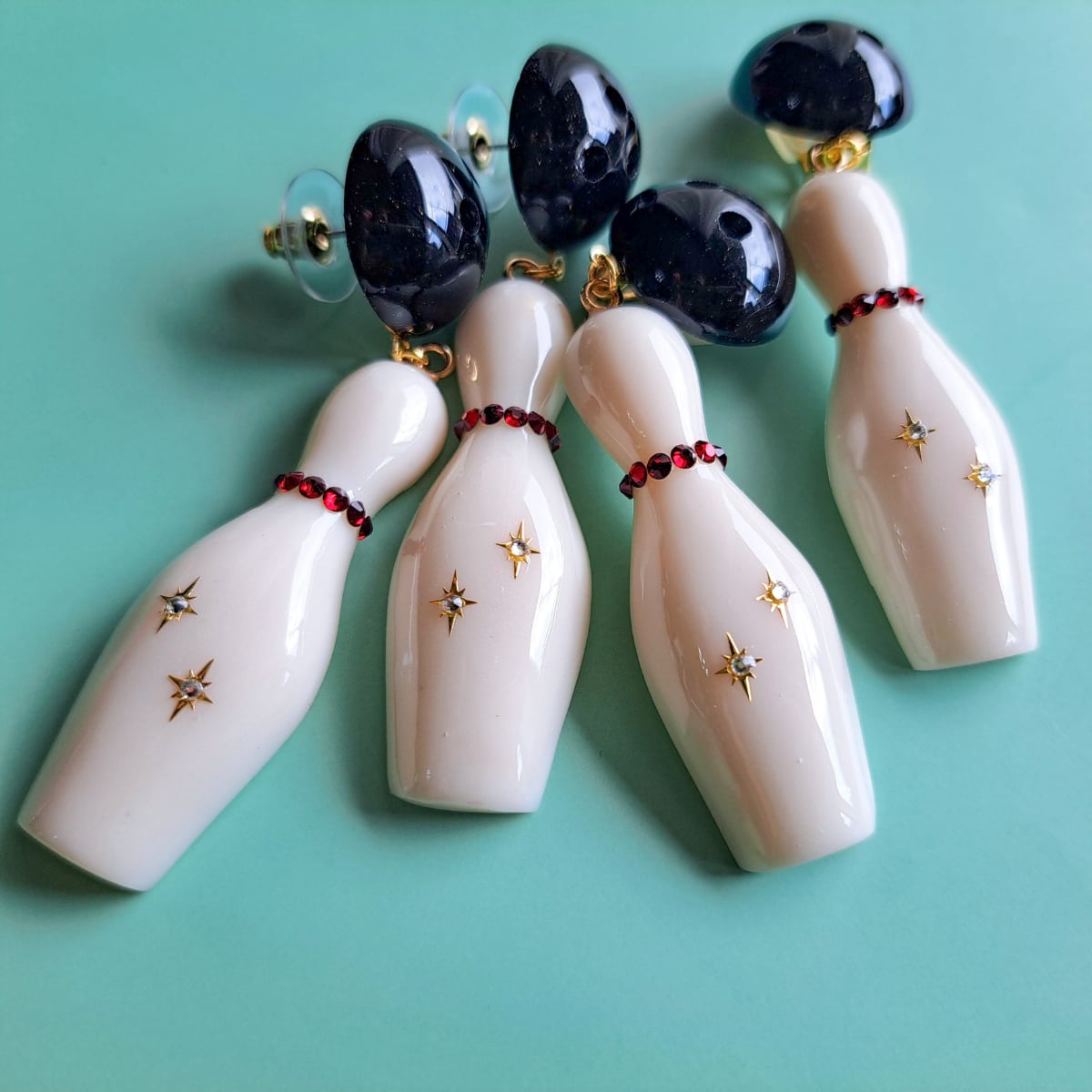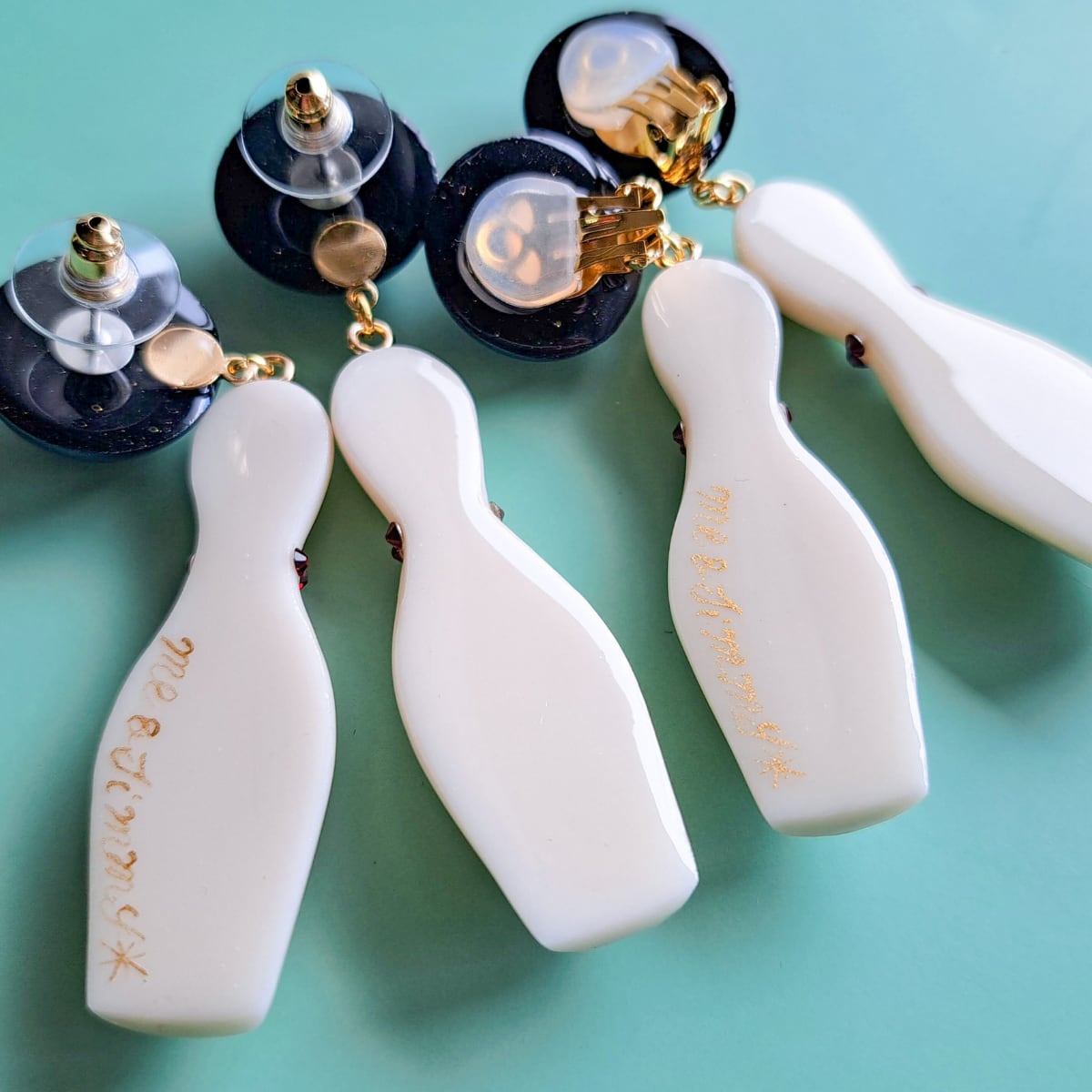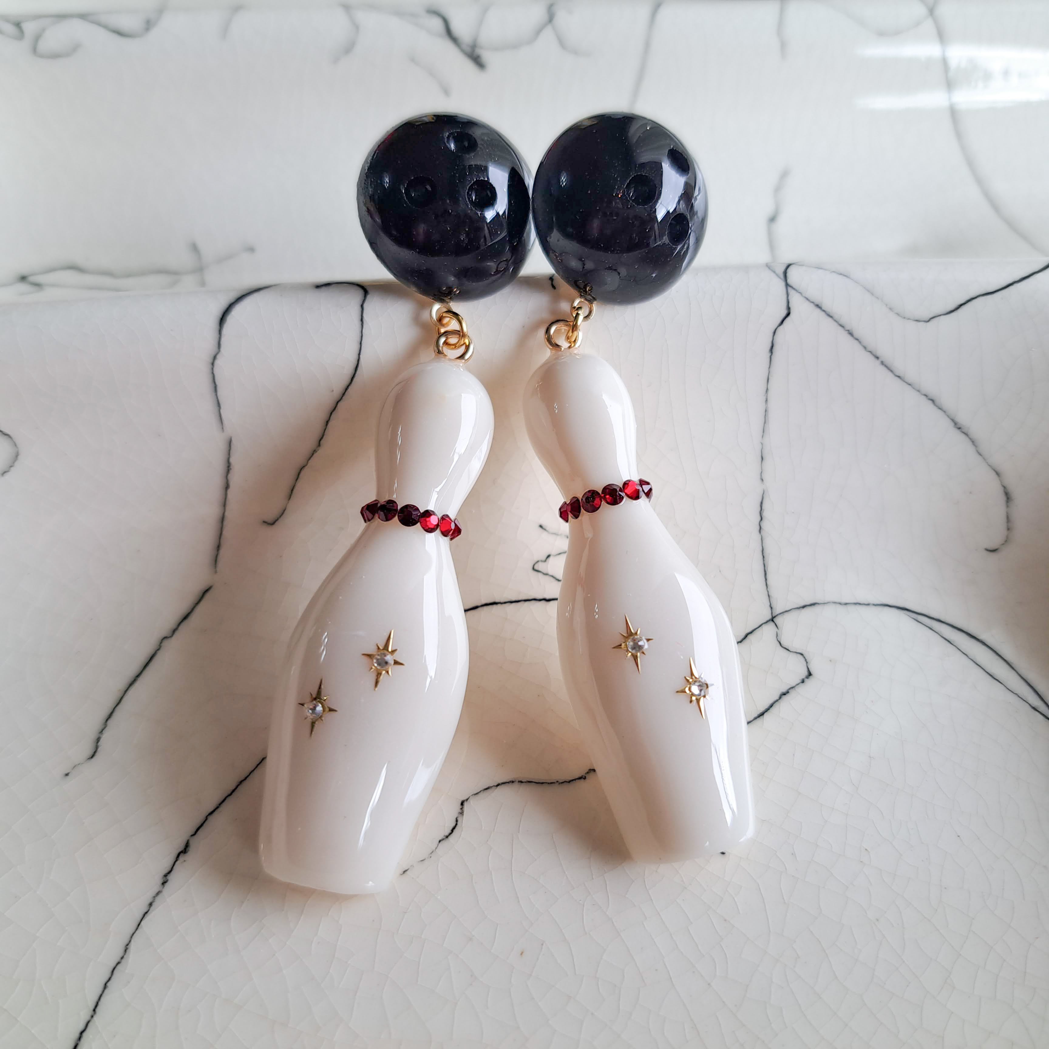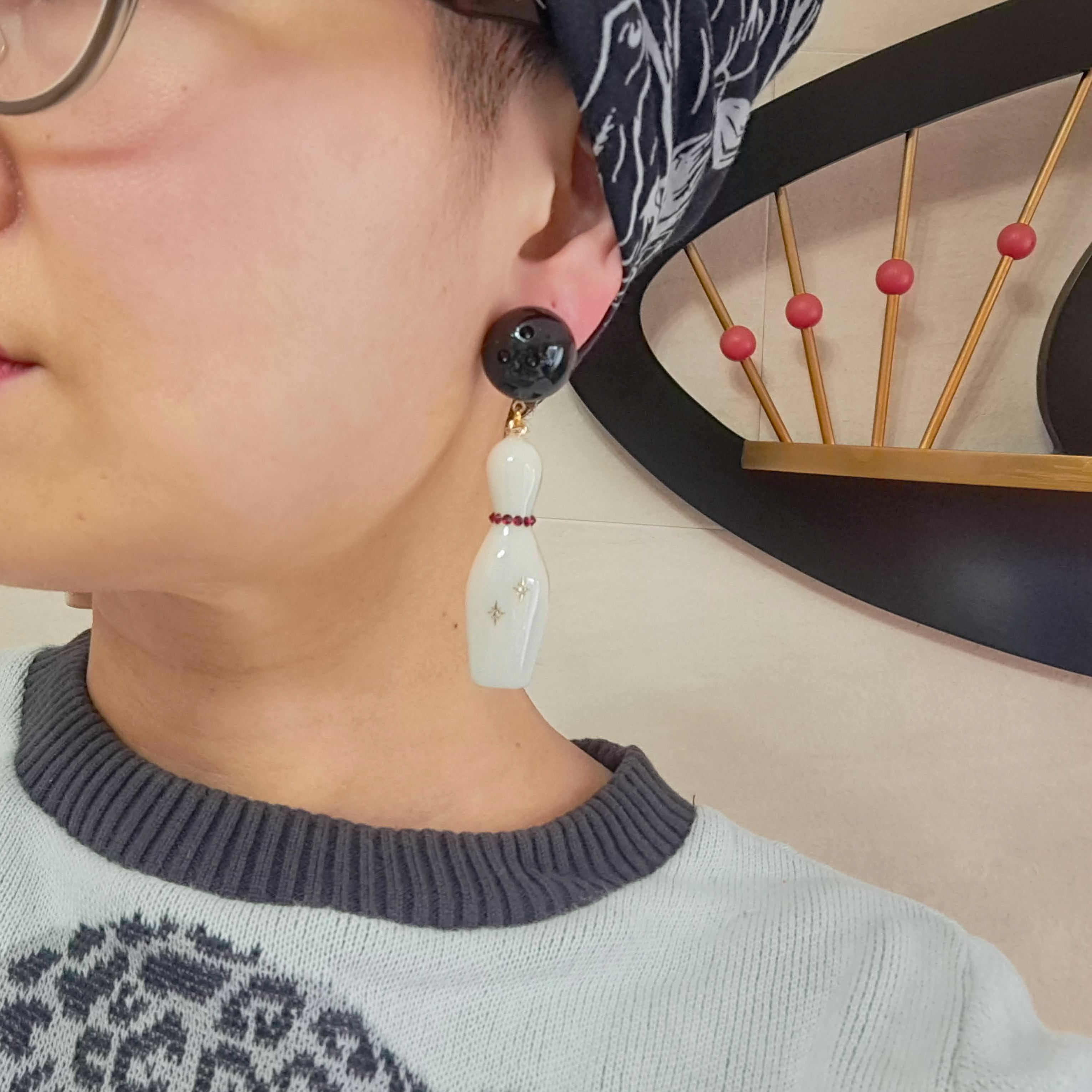 大ぶりのボウリングピンとボールをモチーフにした、存在感たっぷりのピアス・イヤリングです。