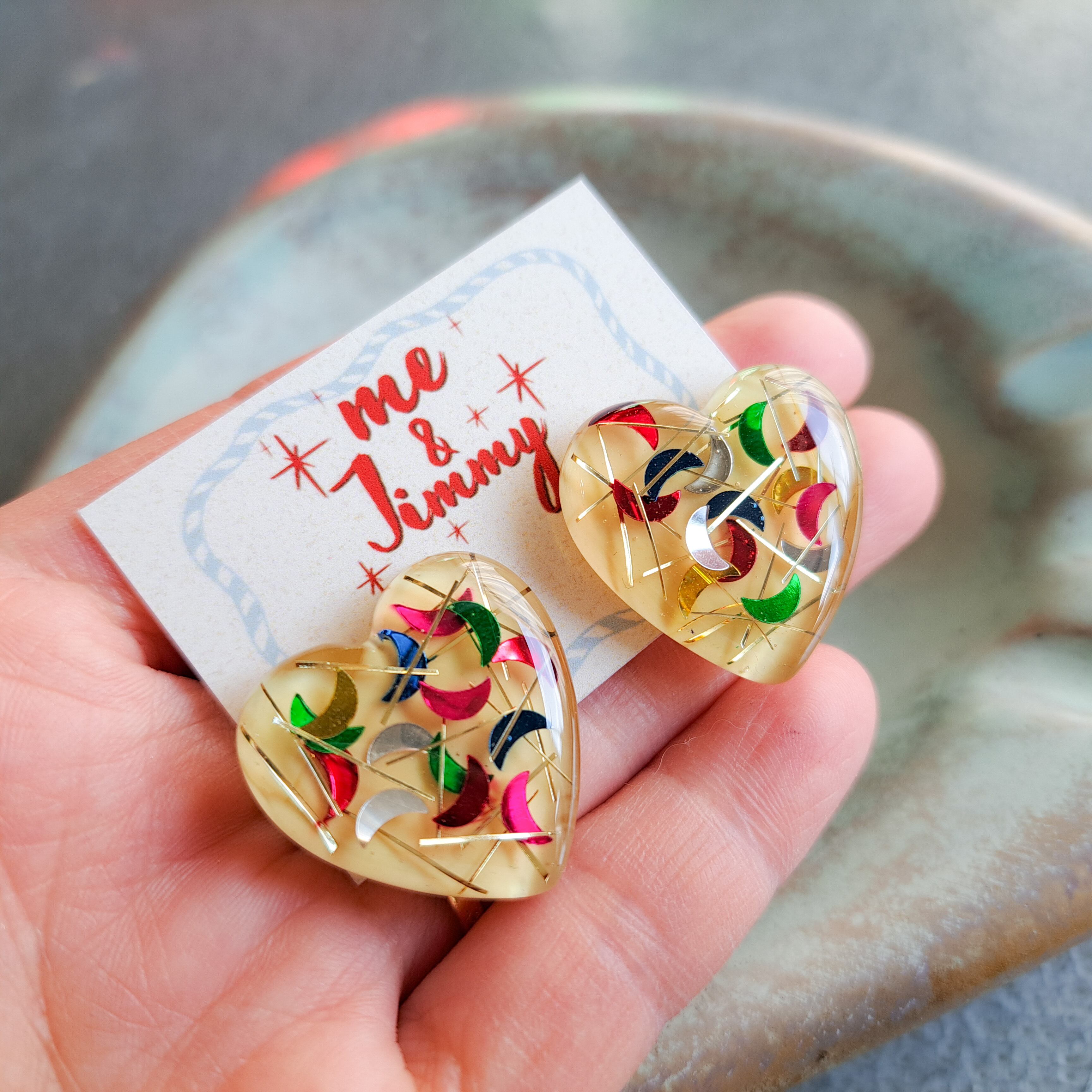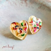 ヴィンテージ感のあるカスタードイエローに、50’sルーサイトを思わせる色とりどりのムーンコンフェッティを閉じ込めたレトロなハートのピアス・イヤリングです。