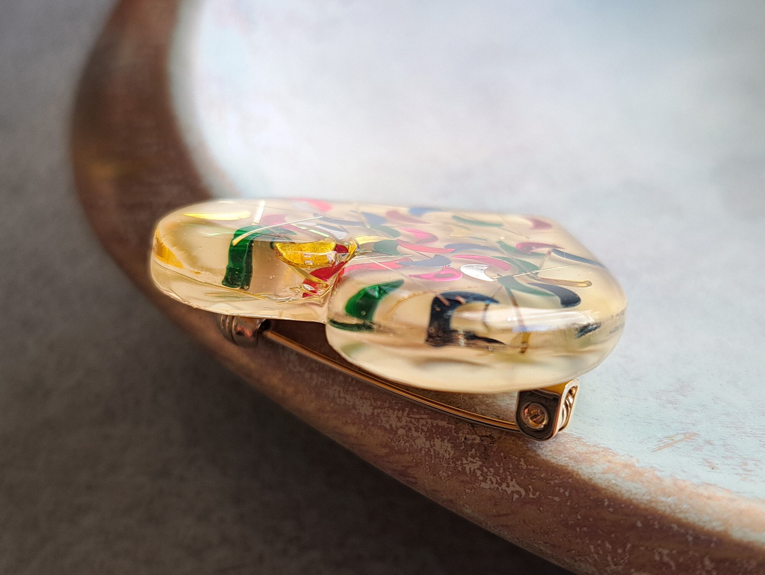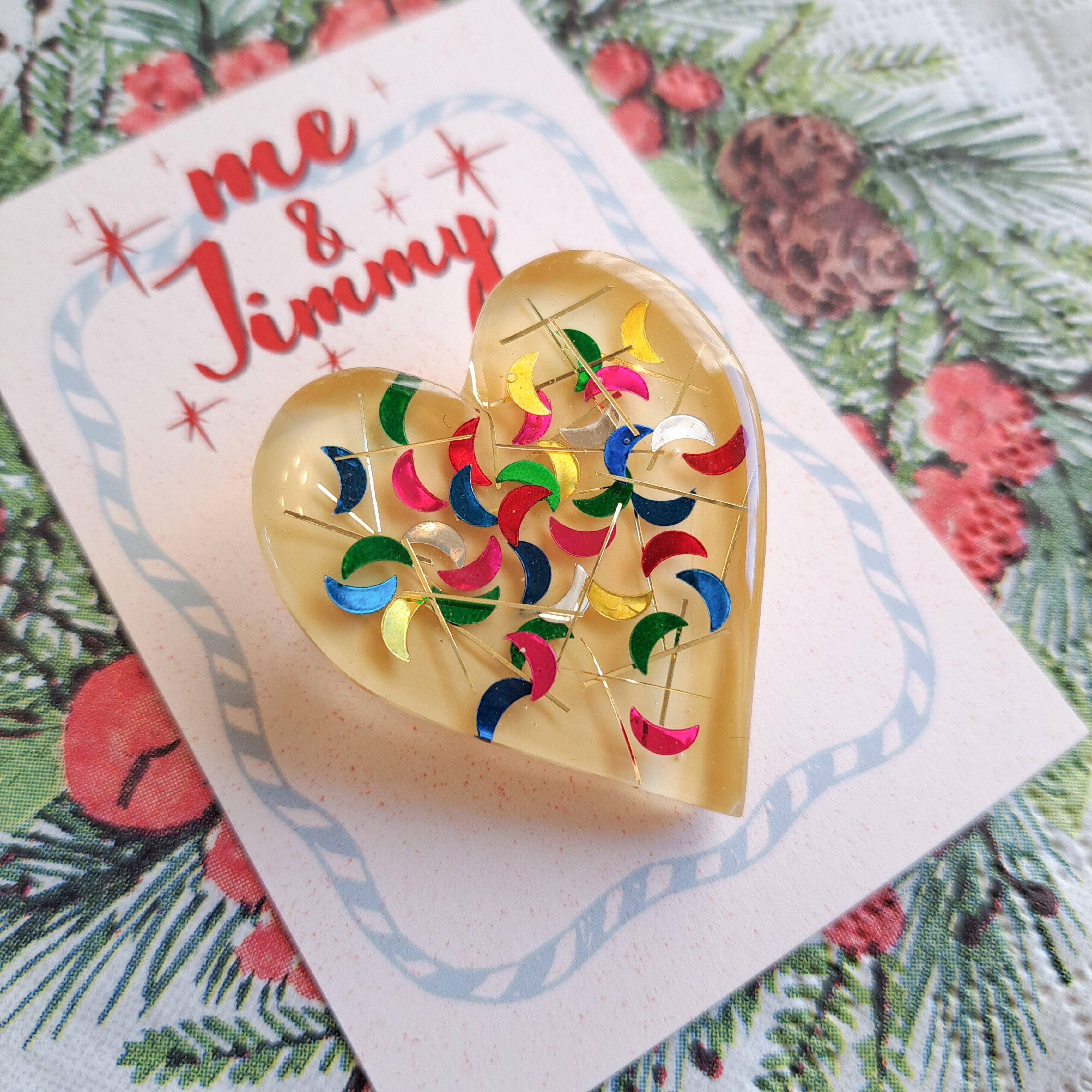 50’sルーサイトを思わせる色とりどりのムーンコンフェッティを閉じ込めたレトロなハートのブローチです。