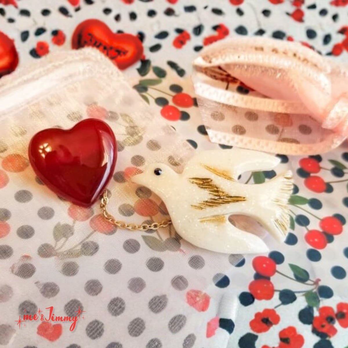 こっくりしたダークチェリーカラーのハート、細かいシェルの粉がキラキラするアイボリーカラーにヴィンテージ風なハンドペイントを施したツバメどちらもレジンで仕上げています。