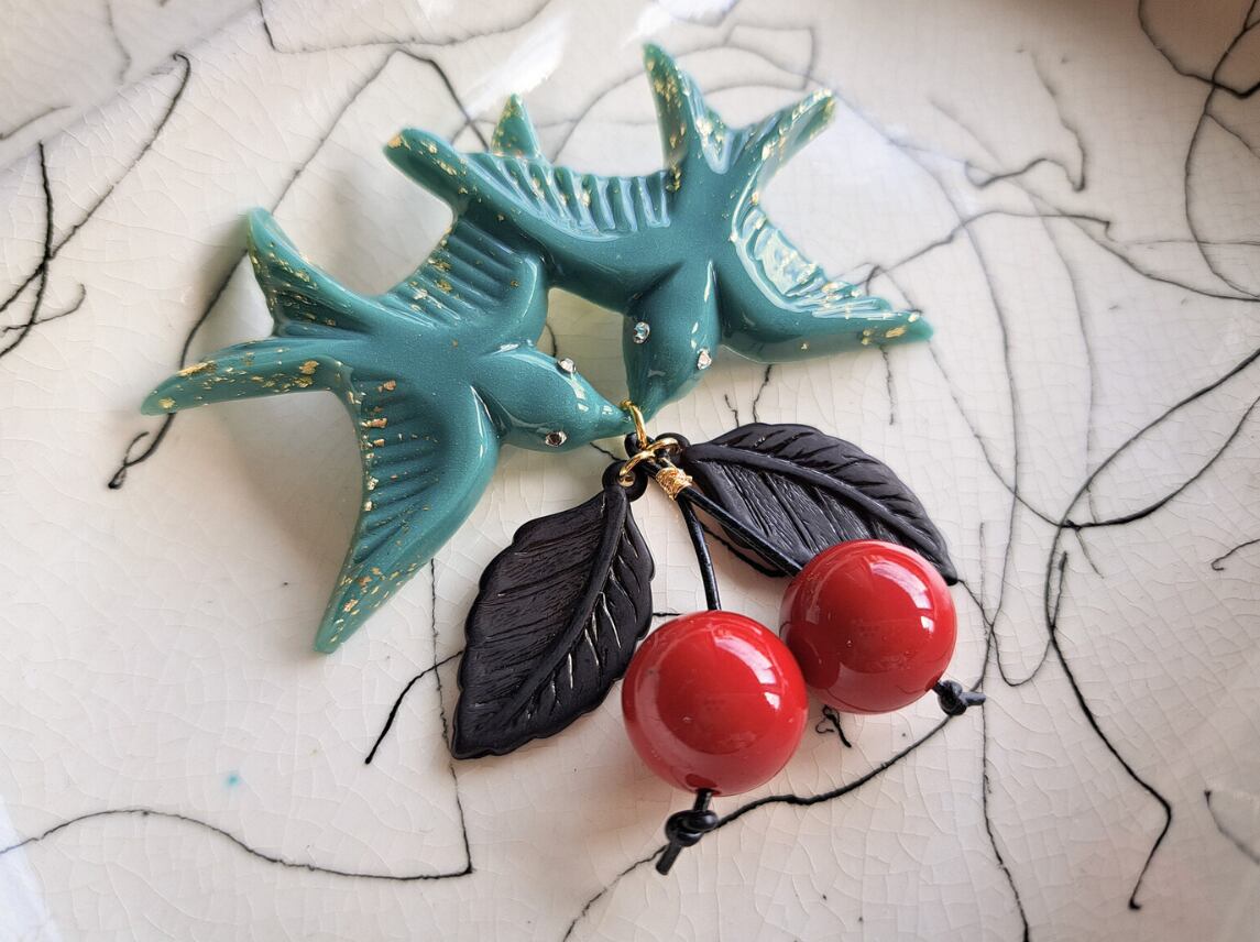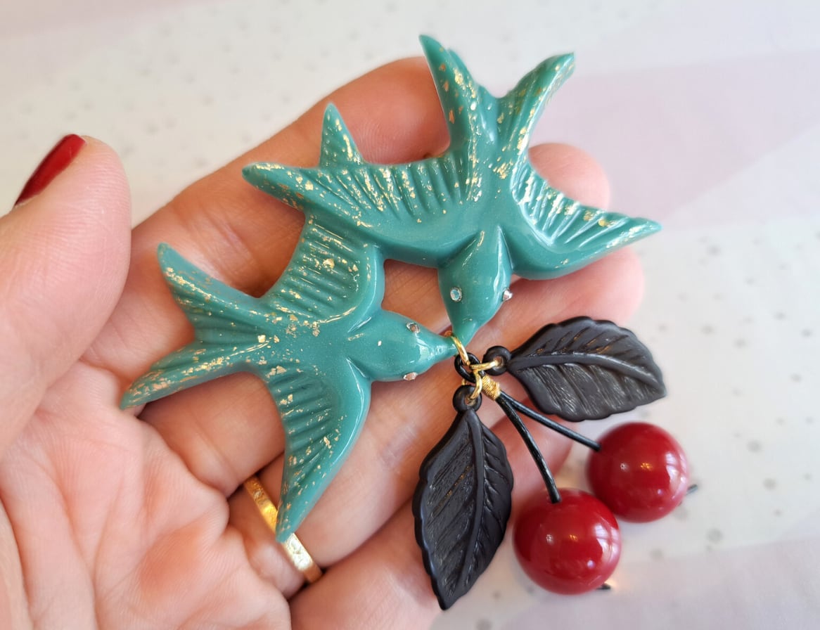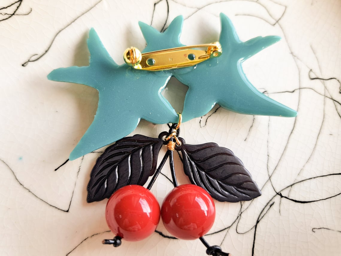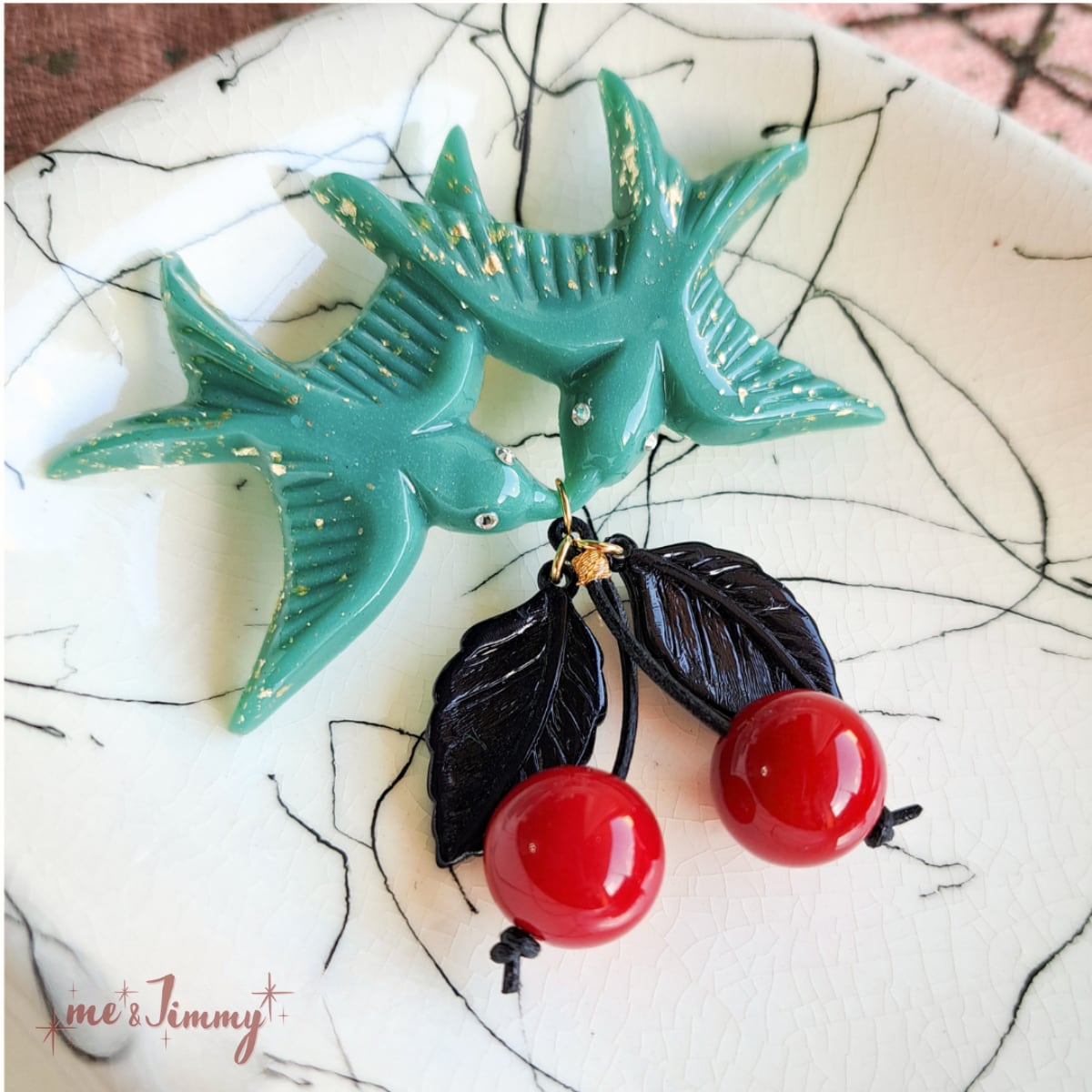 ✴Cherry & Swallow ツバメブローチ✴【ミントグリーン】/ Rockabilly ロカビリー ロックンロール 50's 50s 1950s 1950's 50年代 Rock 1950年代 40's 40s フィフティーズ アクセサリー さくらんぼ チェリー ツバメ スワロー | me & Jimmy