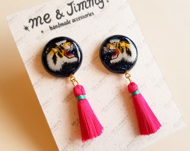 ◆スカ虎タッセルピアス・イヤリング◆【ネイビー×ピンク】/スカジャン ベトジャン フリンジイヤリング タッセルピアス ベトジャンスカ刺繍 アクセサリー ロカビリー Rockabilly 50's 60's 80's 50s 60s 80s ロック Rock ロックンロール | me & Jimmy