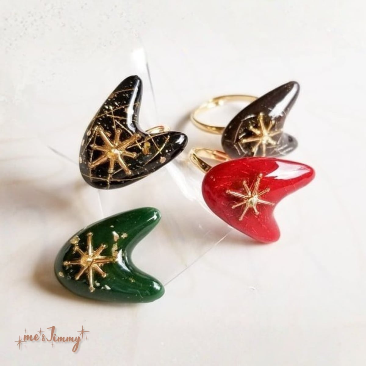 ロカビリー・50's好きにはおなじみブーメランは型からオリジナルで作り、1つ1つレジンにスターバーストを閉じ込めたリング・ピンズにしました✴
