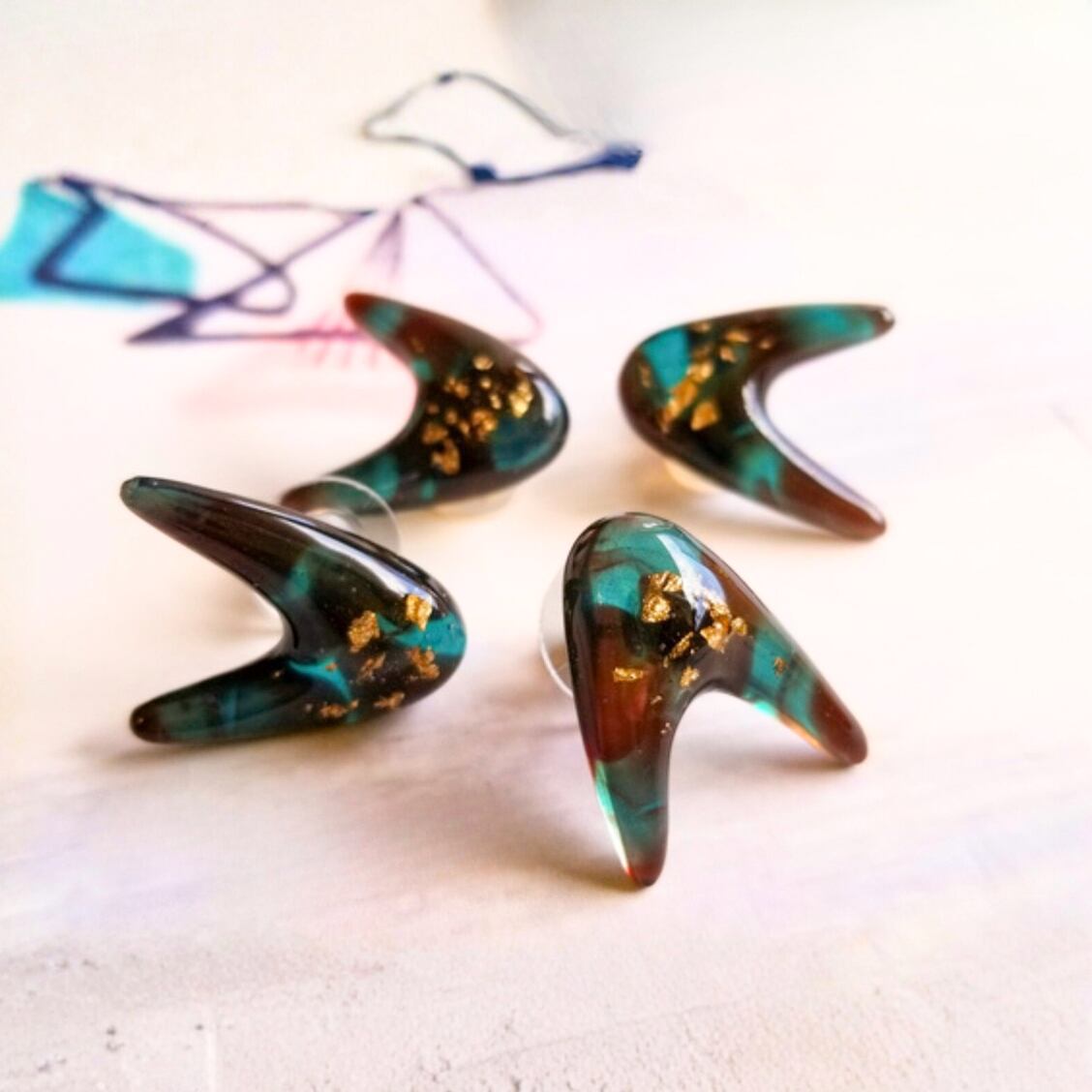 べっこう風のクリア感あるツヤツヤtターコイズ×ブラウンのマーブルにほんの少しの金箔(真鍮製)のアクセントで大人っぽくクールな印象の耳元に仕上げます。