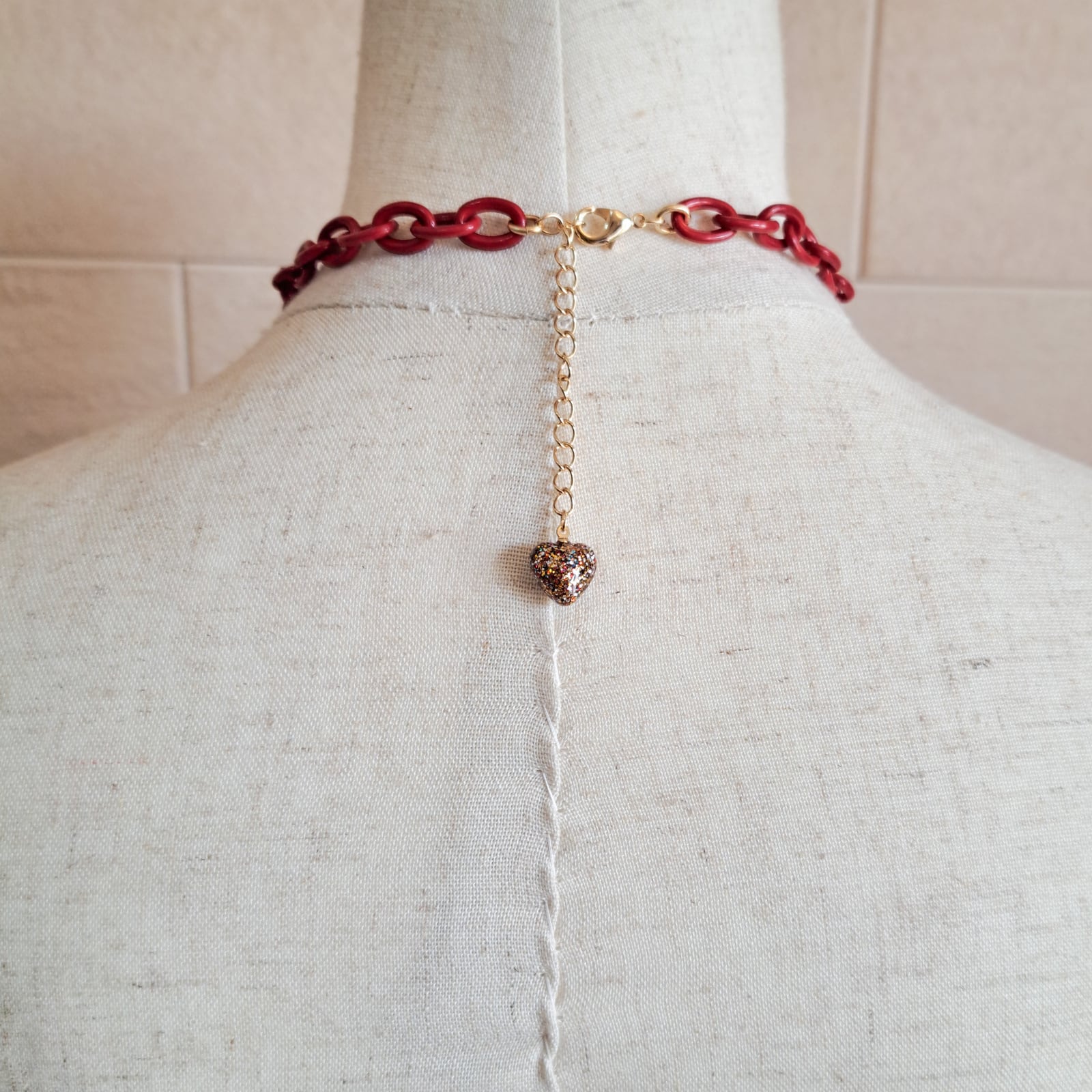 ・深みのある赤色に染色したチェーンと、牛乳のタンパク質から作られた雰囲気あるビーズを木の実のようなヴィンテージレッドに染色し、温かみのある風合いにまとめ上げました