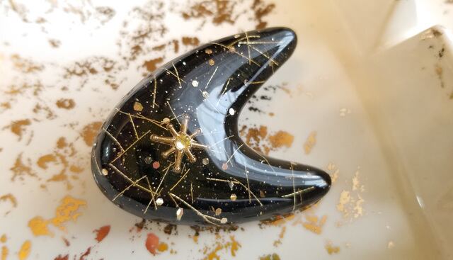 パーツは型からオリジナルで1つ1つレジンで作り、ガラスのような透明感の中にゴールドのグリッターやラメ糸を浮かべワンポイントのスワロフスキーの光るスターバーストがアトミックな雰囲気です✴