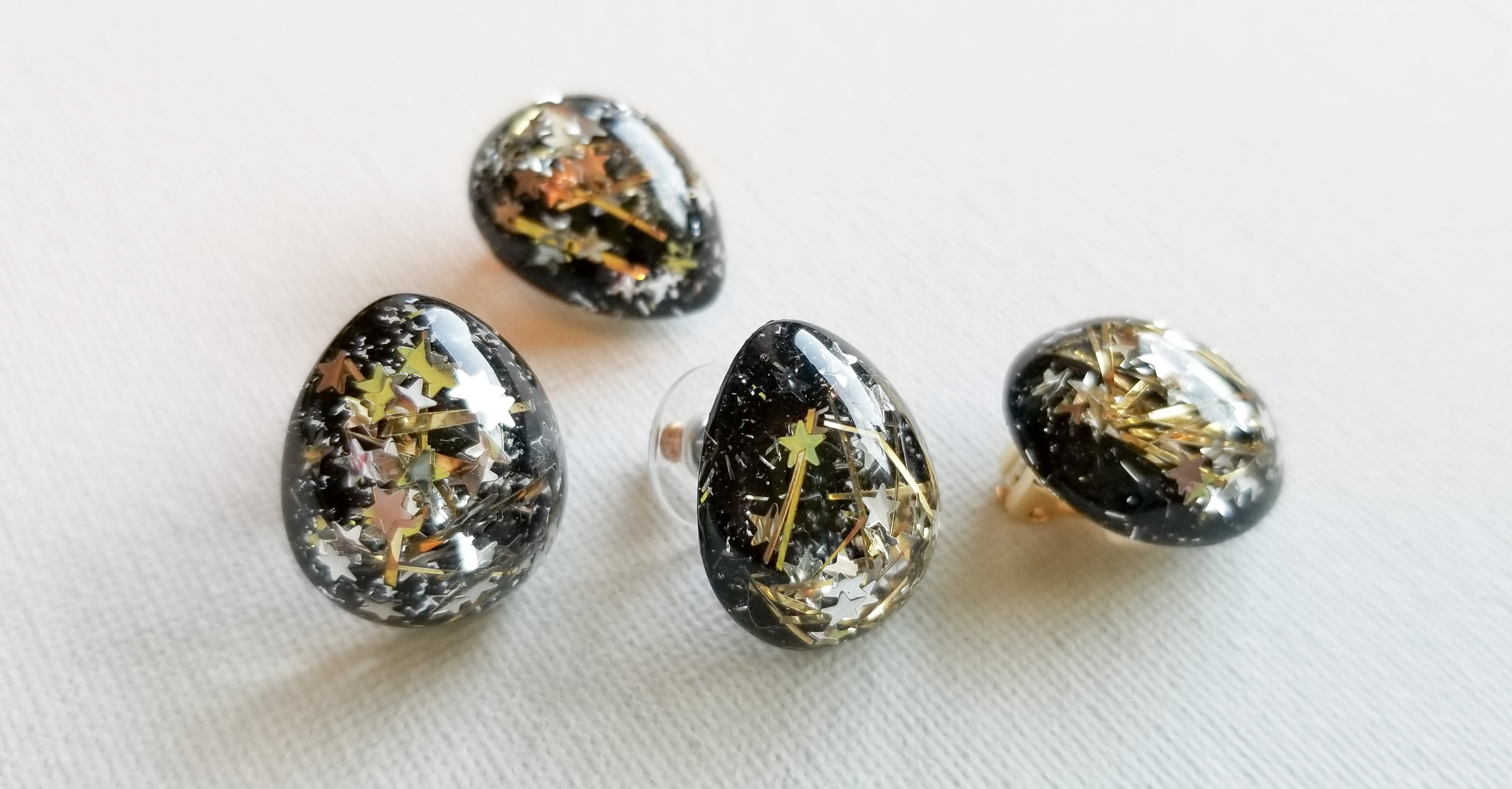 シルバーの星型グリッター(画像では金色に見える星は光の加減によるものです)とゴールドのラインのクリア層とブラックのグリッターの層を極力気泡が入らないよう重ねてキラキラ奥行きのある仕上がりです。
