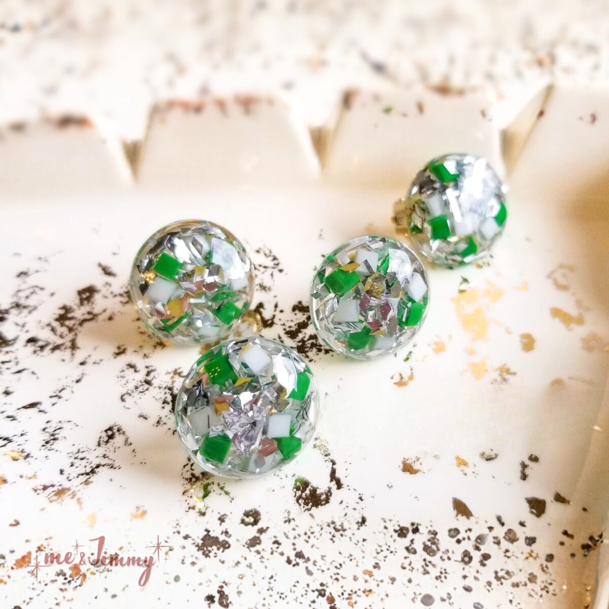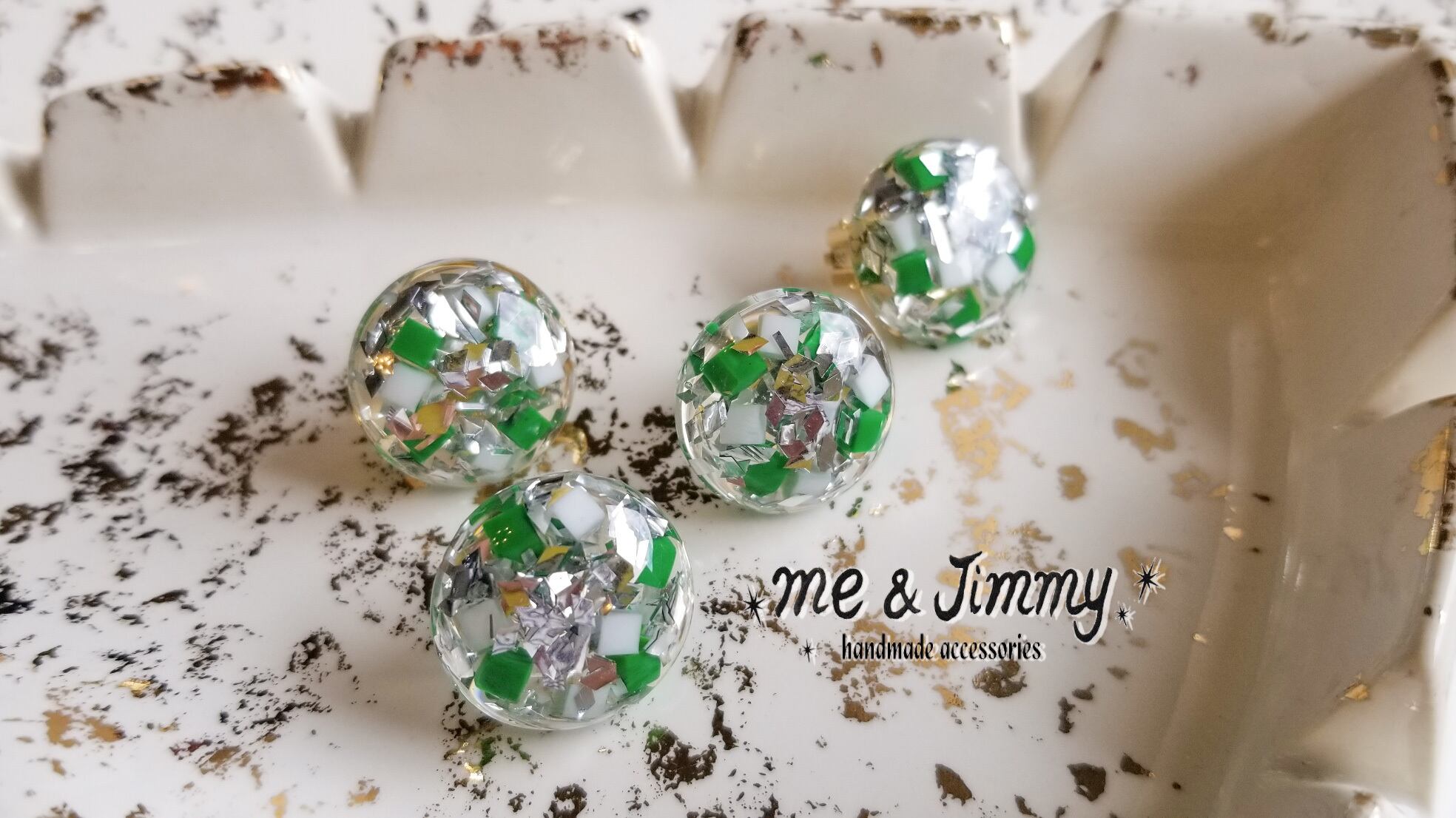 こちらはクリアベースに小さなグリーンとホワイトのキューブを作り、シルバーのフレークと一緒に閉じ込めたキラキラ爽やかな印象です。