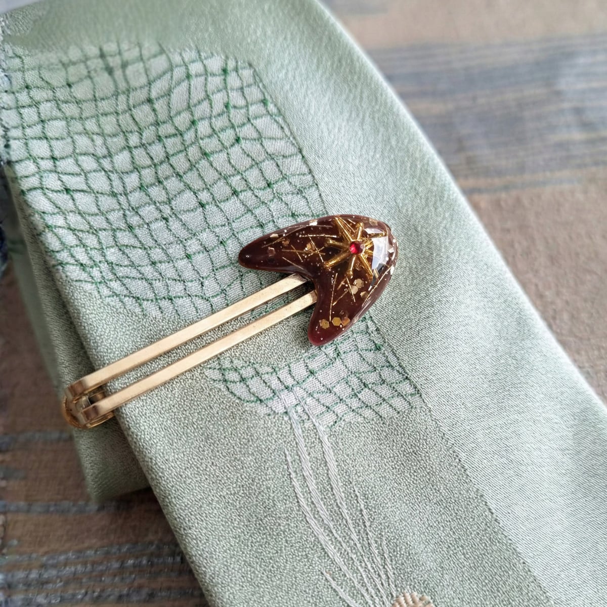 スターバーストに一粒の赤いラインストーンが煌めき、ミッドセンチュリーの空気感漂う男性の装いに馴染むサイズ感とデザインに仕上げました。