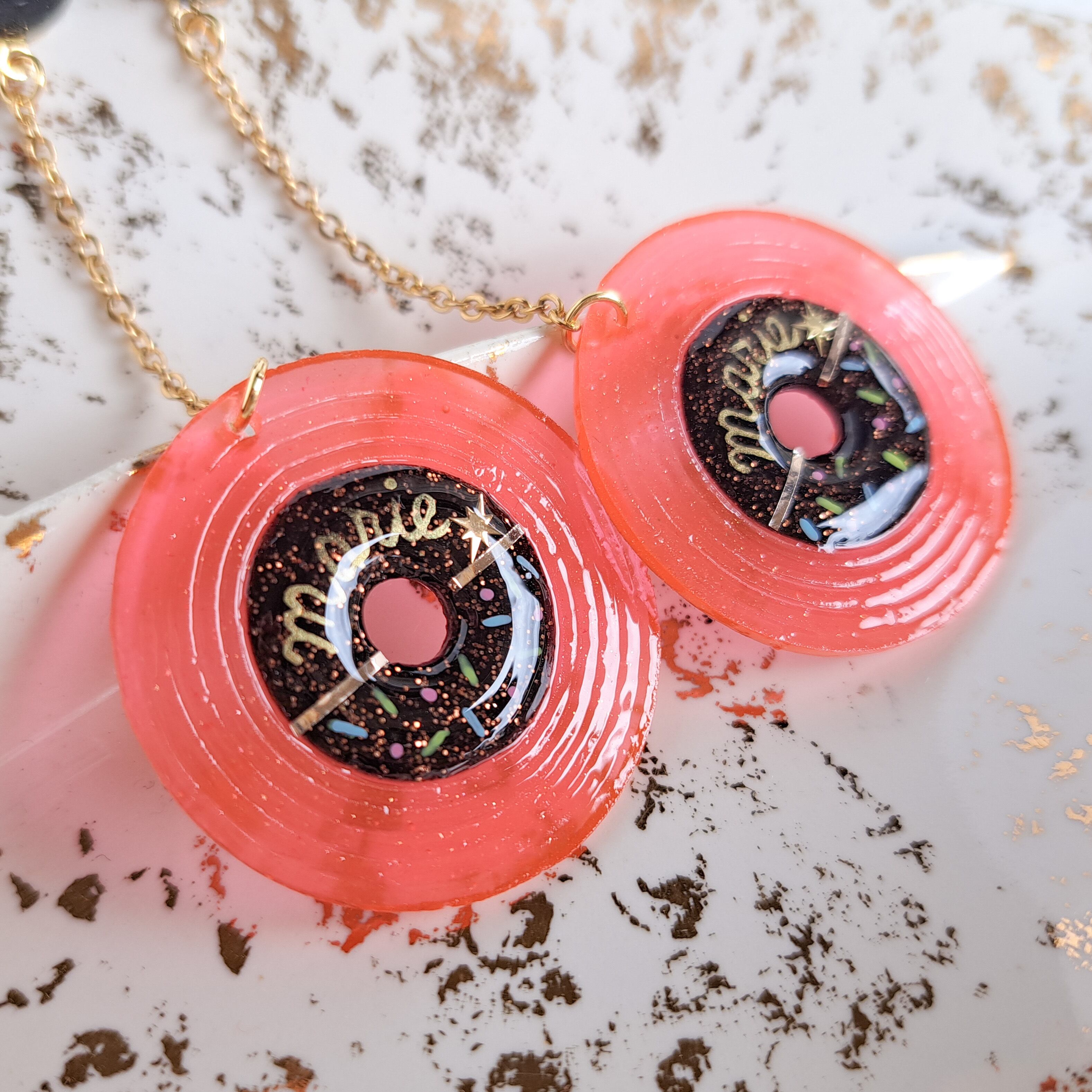 ・ラメ入りダークチョコレートブラウンのレーベル面にはシャンパンゴールドライン、80'sメンフィス風幾何学模様+ボウリングシャツ風「Marie」ペイント