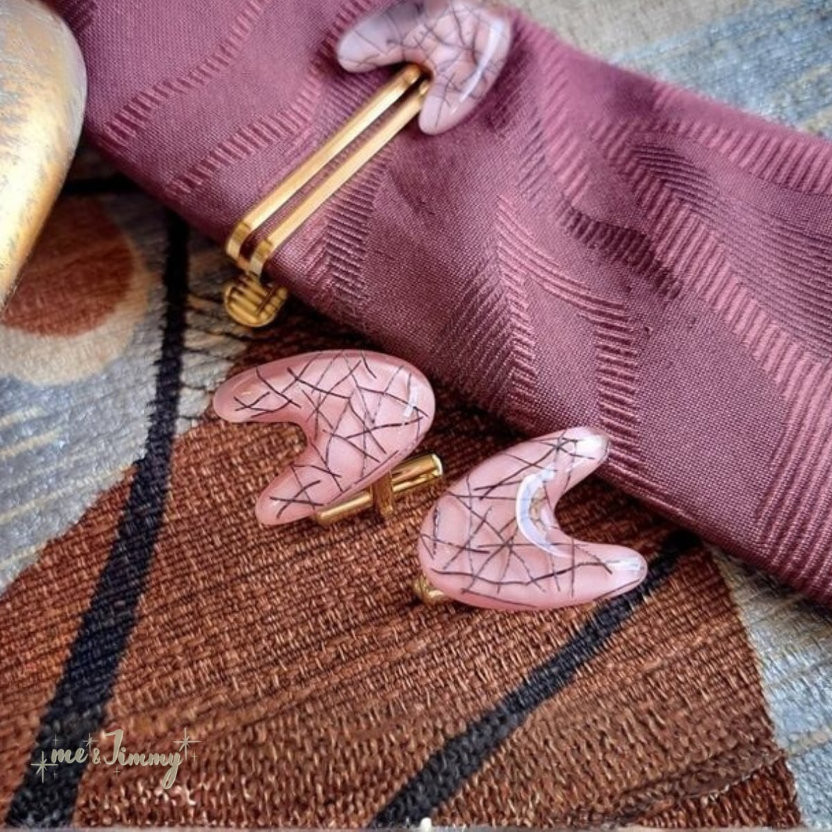 ピンクベースにグレーのラメ糸のランダムな模様が浮かぶロカビリー・50sスタイルにぴったりなブーメラン型カフリンクスです。