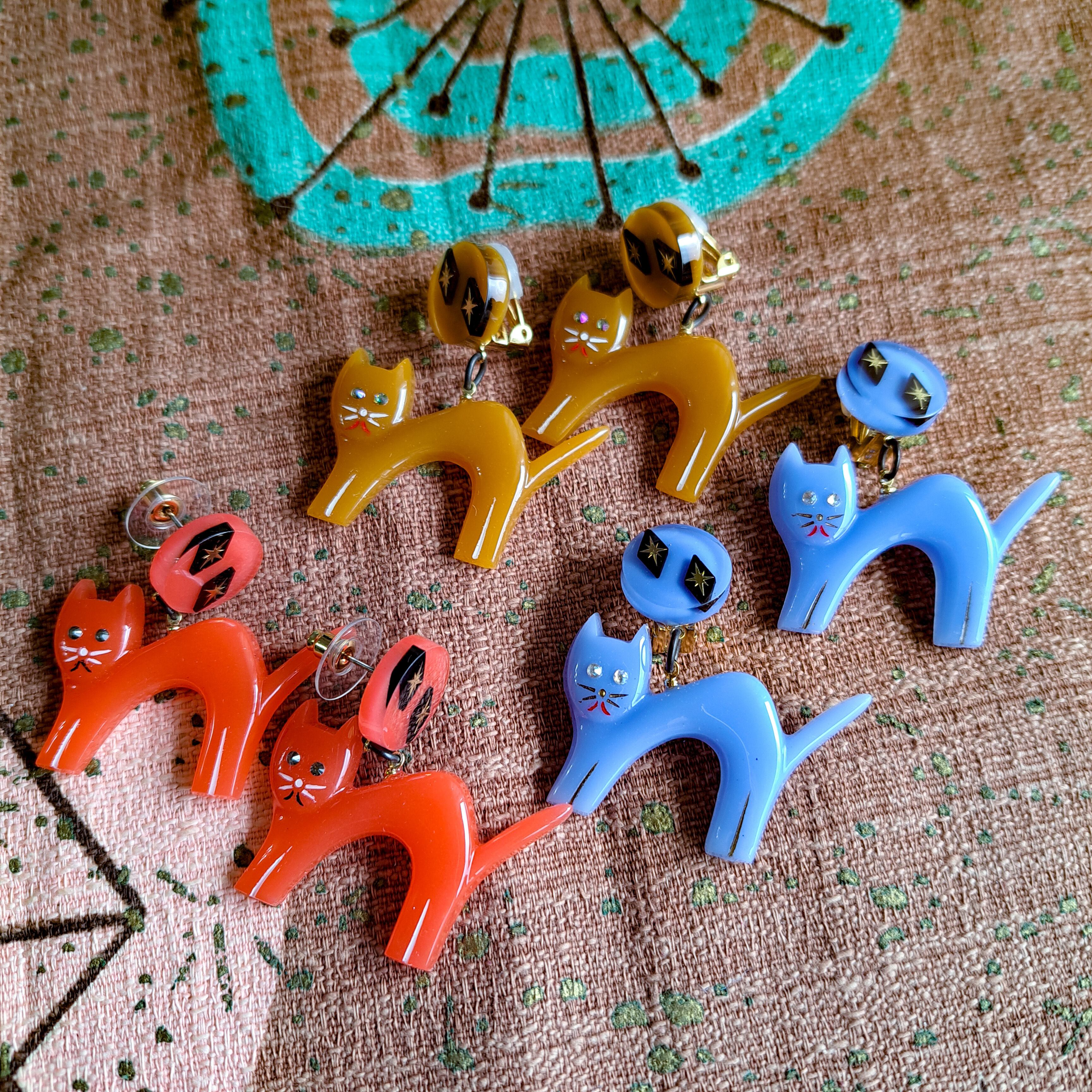 瞳には月明りのように白っぽく光るクリスタルムーンライトのラインストーンを使用し、ひし形にメタルのスターバーストを合わせたミッドセンチュリーテイストのトップを合わせることでアクセサリーとしての華やかさや上品さも大切にしています。