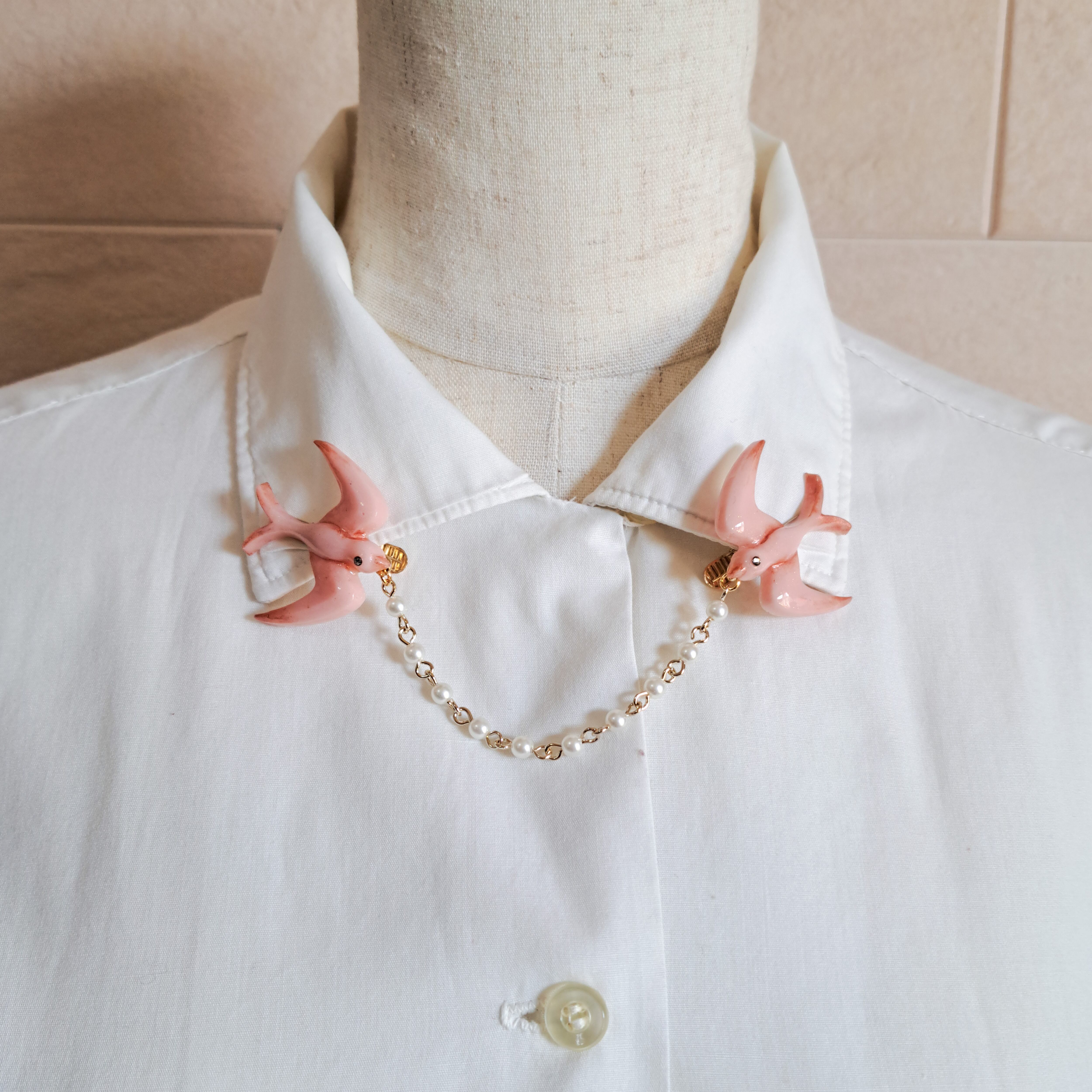 しっかり留まるワニ口クリップなので肩掛けカーディガンや襟元はもちろん、ショールやストールクリップとしてもアクセントに。ツバメはどちらを向いても様になるデザインです。