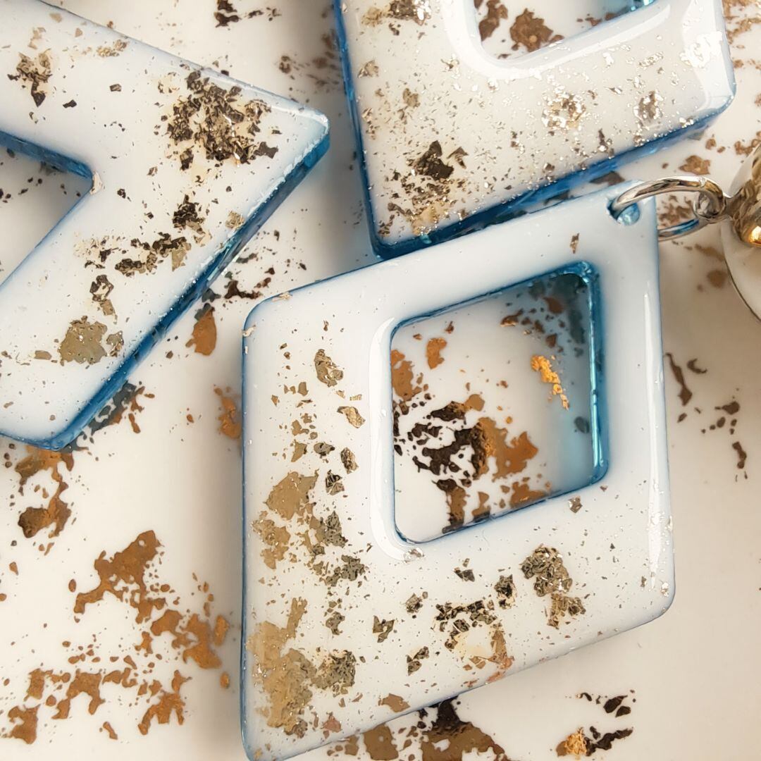 光を浴びるたびにキラキラと上品な輝きを放つよう、透明感あふれるマリンブルーのレジンに、洗練された量の短冊ラメと極小の微細ラメを閉じ込めました。