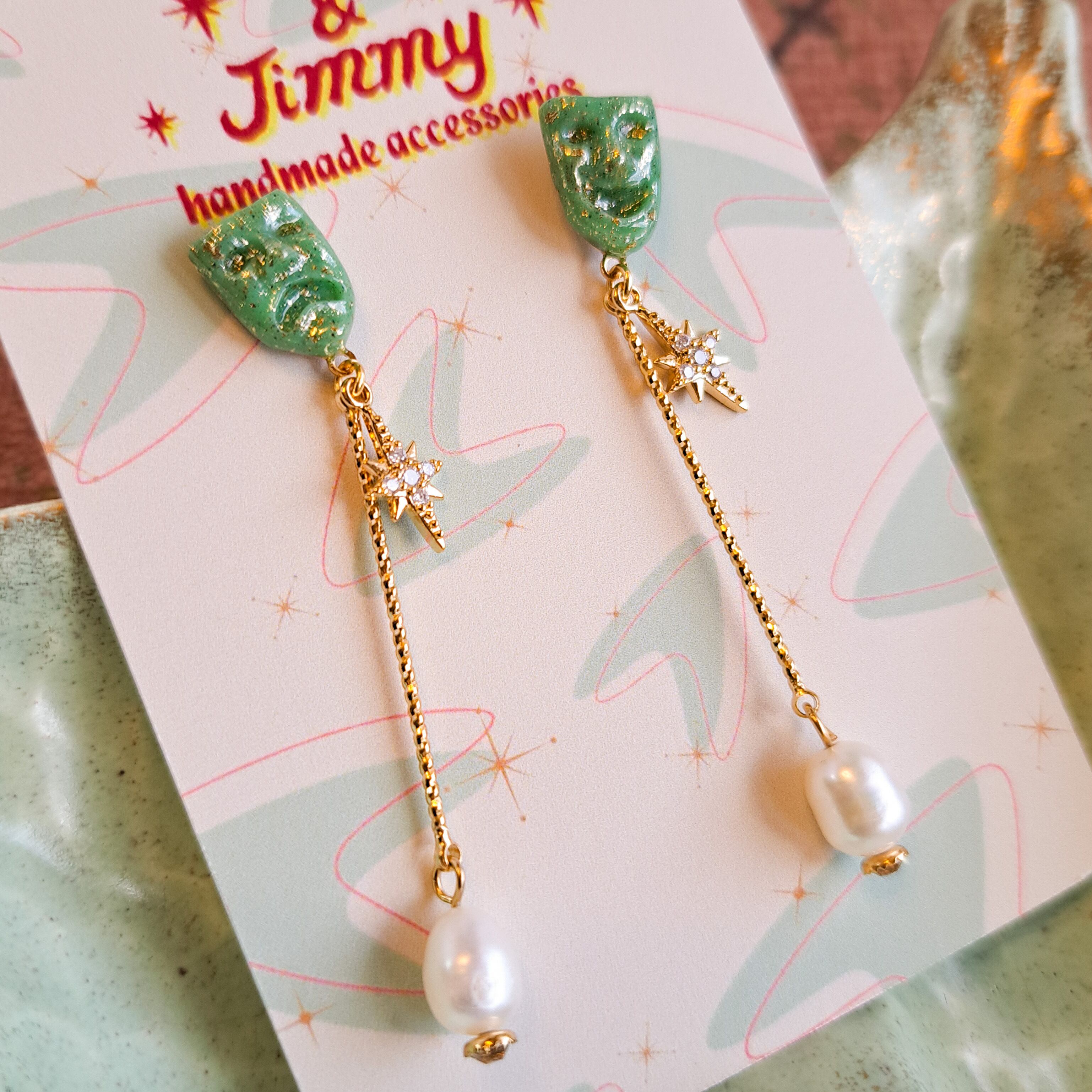 50's Two Faceトゥインクルスティックパールピアス・イヤリング【ジェイドグリーン】Comedy and tragedy twinkle stick freshwater pearl earrings